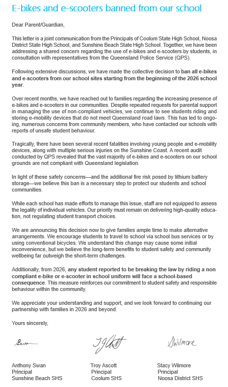 Following a Queensland Police Service (QPS) audit at our local public high schools, which revealed the vast majority of e-bikes and e-scooters were non-compliant with Queensland legislation, Sunshine Beach State High School (SBSHS), Noosa District State High School (NDSHS) and Coolum State High School (CSHS) have announced a ban on all e-bikes and e-scooters from their school sites beginning in 2026.